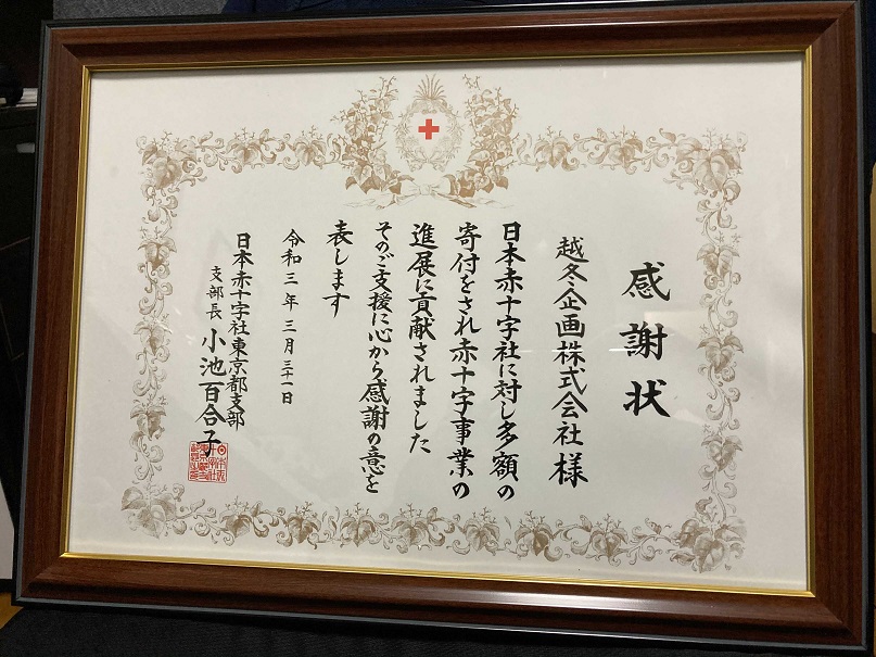 CSR先日、日本赤十字社 東京都市部から感謝状を頂きました。